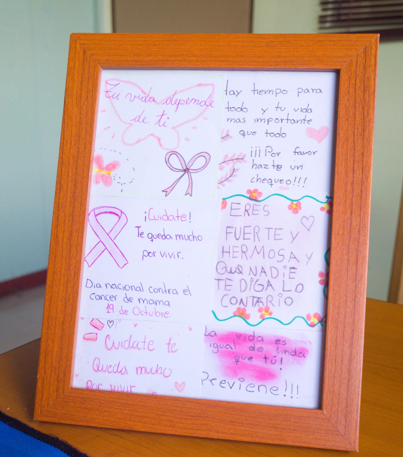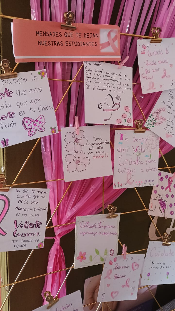 También estudiantes de primero medio A y ambos octavos realizaron tarjetas que fueron entregadas en dicha instancia, dichos mensajes eran orientados a que funcionarios se movilicen en el autocuidado, acudiendo a tiempo a consultar frente a cambios que se perciban y buscar tratamientos a tiempo. Algunos de los tantos mensajes compartidos fueron “tu vida depende de ti”; “cuídate, te queda mucho por vivir” ; “hay tiempo para todo y tu vida es más importante que todo, por favor hazte un chequeo”, “el poder de tu bienestar está en tus manos, prevenir es un acto de fortaleza y amor” “una mamografía al año, no hace daño” etc.