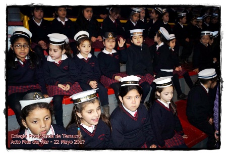 El Lunes 22 de Mayo de 2017, se desarrolló un acto conmemorativo al Mes del Mar a cargo del Primer Ciclo Básico de nuestro colegio (1° Básico A y B, 2° Básico A y B, 3° y 4° Básico). En esta ocasión asistió todo el colegio, quienes entonaron el Himno Nacional dirigido por el Profesor Juan Ulloa. Ademas se presentaron varios numeros artisticos de parte de las mismas alumnas de primer ciclo, quienes deleitaron de dichos números a todas sus compañeros, profesores y apoderados presentes con estos hermosos.