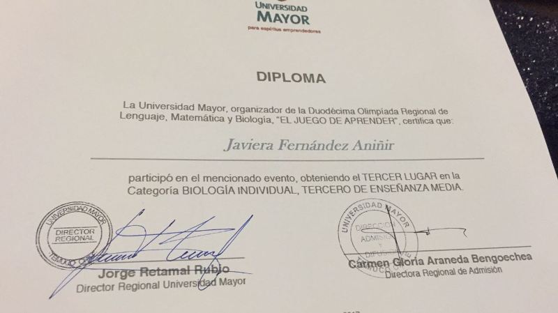 El año 2015 un pequeño grupo de 3 alumnas de cuarto medio habian logrado imponerse en la final con el tercer lugar por equipos en categoria Biologia. Este año 2017, luego de rendir tres pruebas y clasificar para la Semifinal y final, las estudiantes de Tercero Medio, Francesca Bustos y Javiera Fernandez han obtenido el Segundo y tercer Lugar respectivamente, en la categoria Biologia, Modalidad Individual.