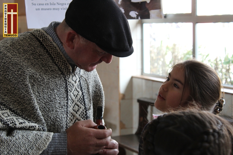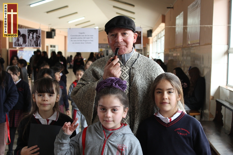 Durante los recreos, nuestros estudiantes tuvieron la oportunidad de sumergirse en un espacio ambientado con elementos de la vida y obra del autor. Uno de los momentos más emotivos fue la personificación del poeta, realizada con gran dedicación y cariño por don René Dinamarca, quien recorrió el ambiente compartiendo fragmentos de su legado.