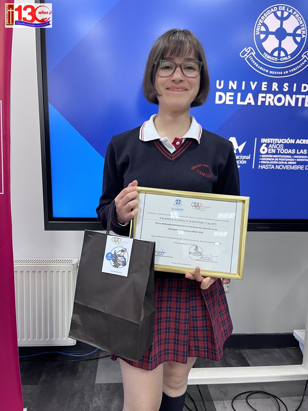 El evento tuvo lugar el día lunes 09 de diciembre en la Universidad de La Frontera (UFRO). Amanda estuvo acompañada por su profesora de Química, María Teresa Contreras, quien la apoyó y guió en este importante desafío académico.