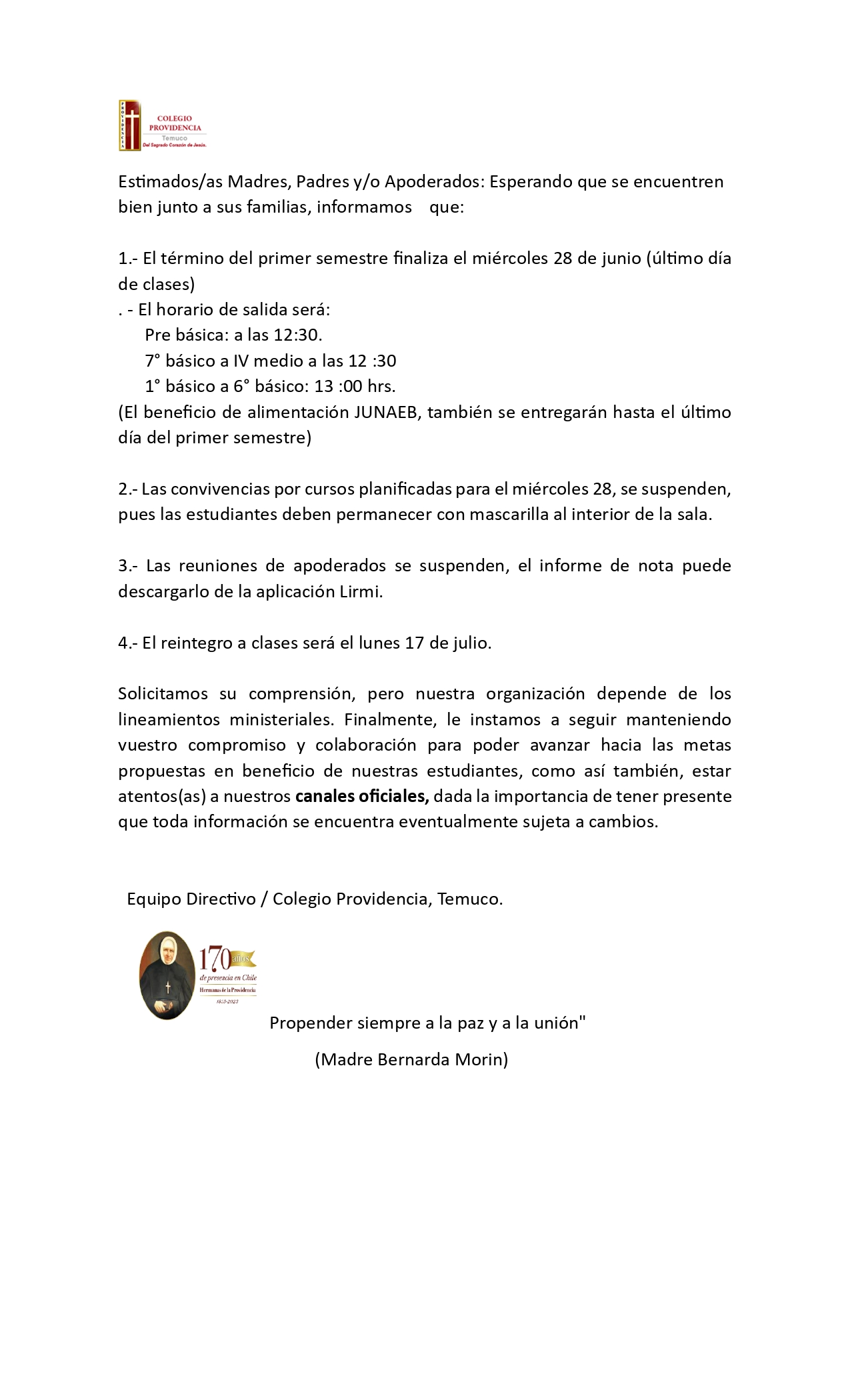 El Colegio Providencia de Temuco tiene como misión ser presencia de Dios Padre Providente y de nuestra Madre Virgen de los Dolores, en la acogida, confianza, respeto, comprensión, humildad y misericordia.