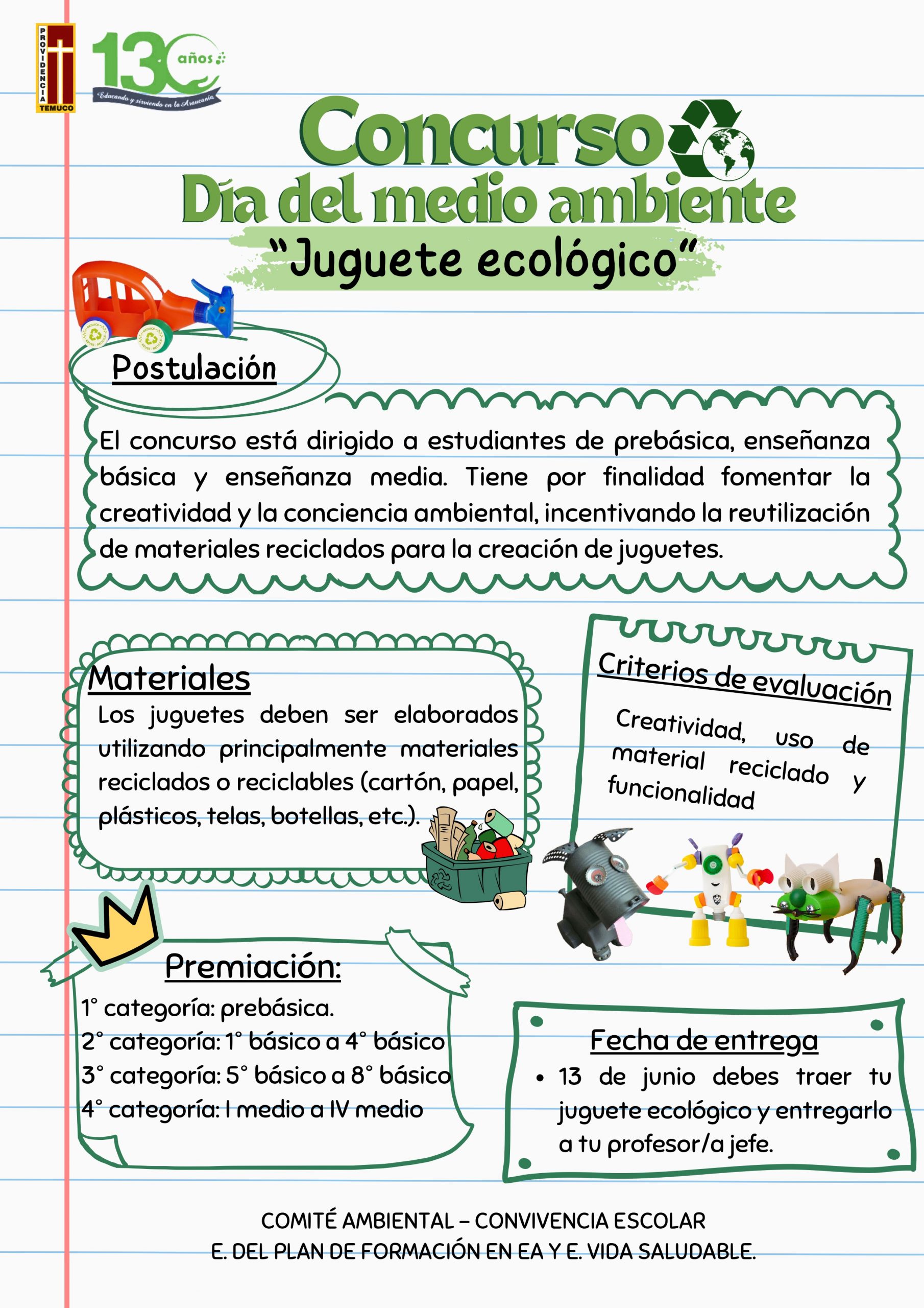 Hoy, 5 de junio, se celebra el Día del Medio Ambiente. Por este motivo, como comunidad educativa, invitamos a nuestras estudiantes a participar en el concurso “Juguete Ecológico”. Esta iniciativa tiene como objetivo potenciar la creatividad y la conciencia ambiental, incentivando la reutilización de materiales reciclados para la creación de juguetes. ¡Anímense a participar y demostremos juntos nuestro compromiso con el cuidado del planeta! 🌍♻️