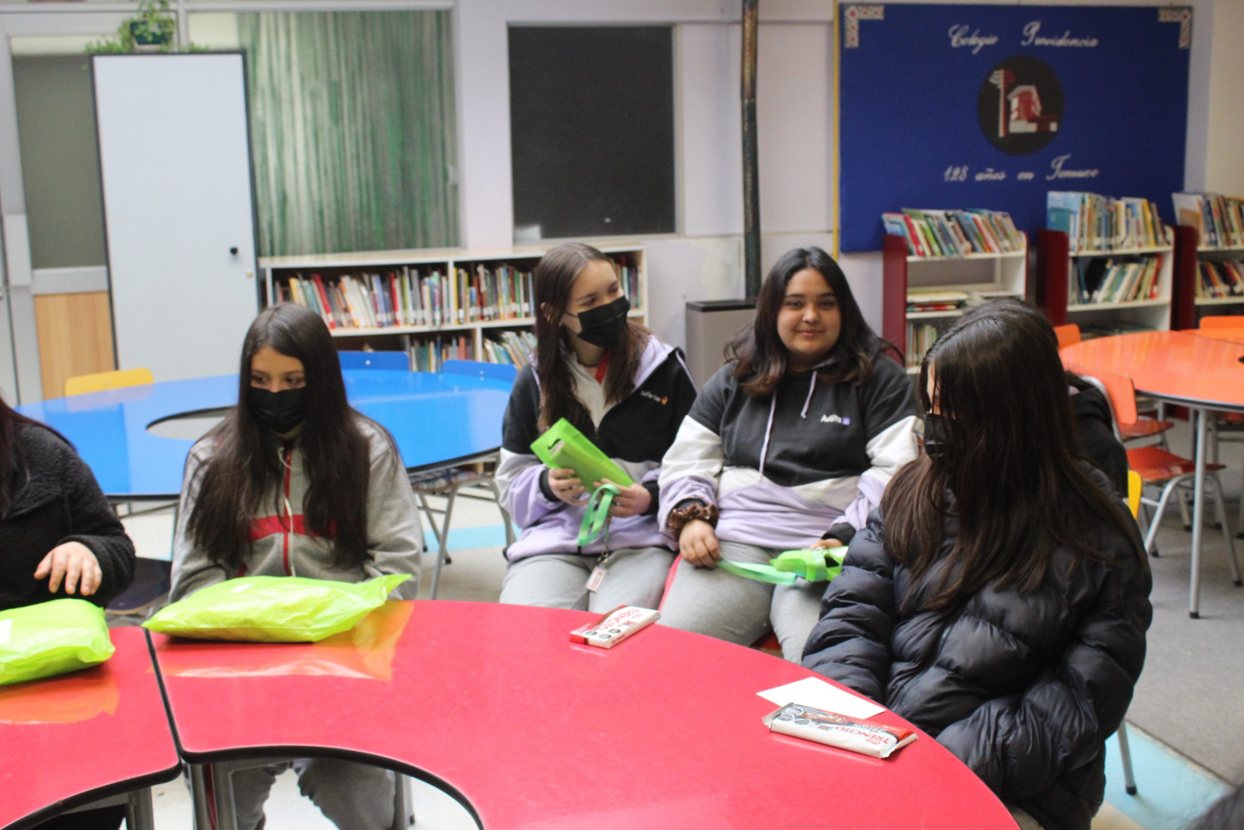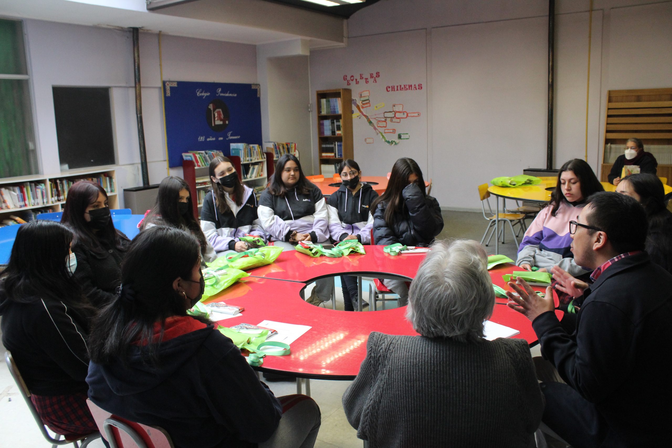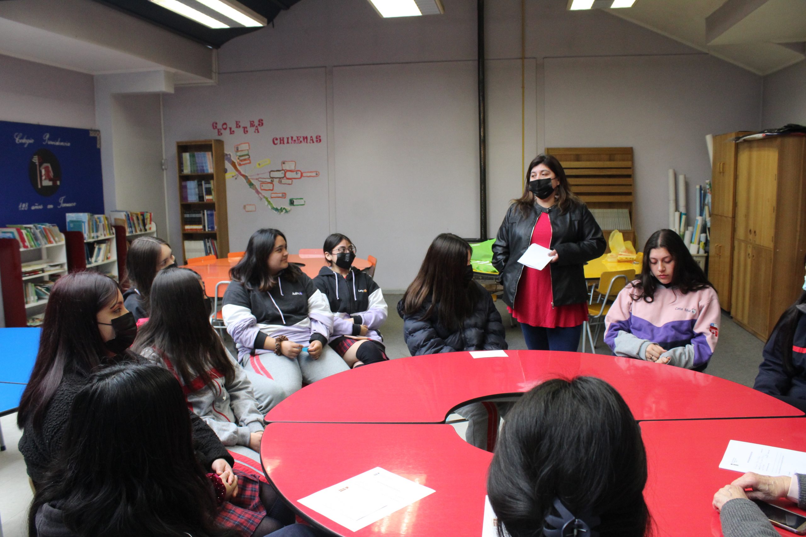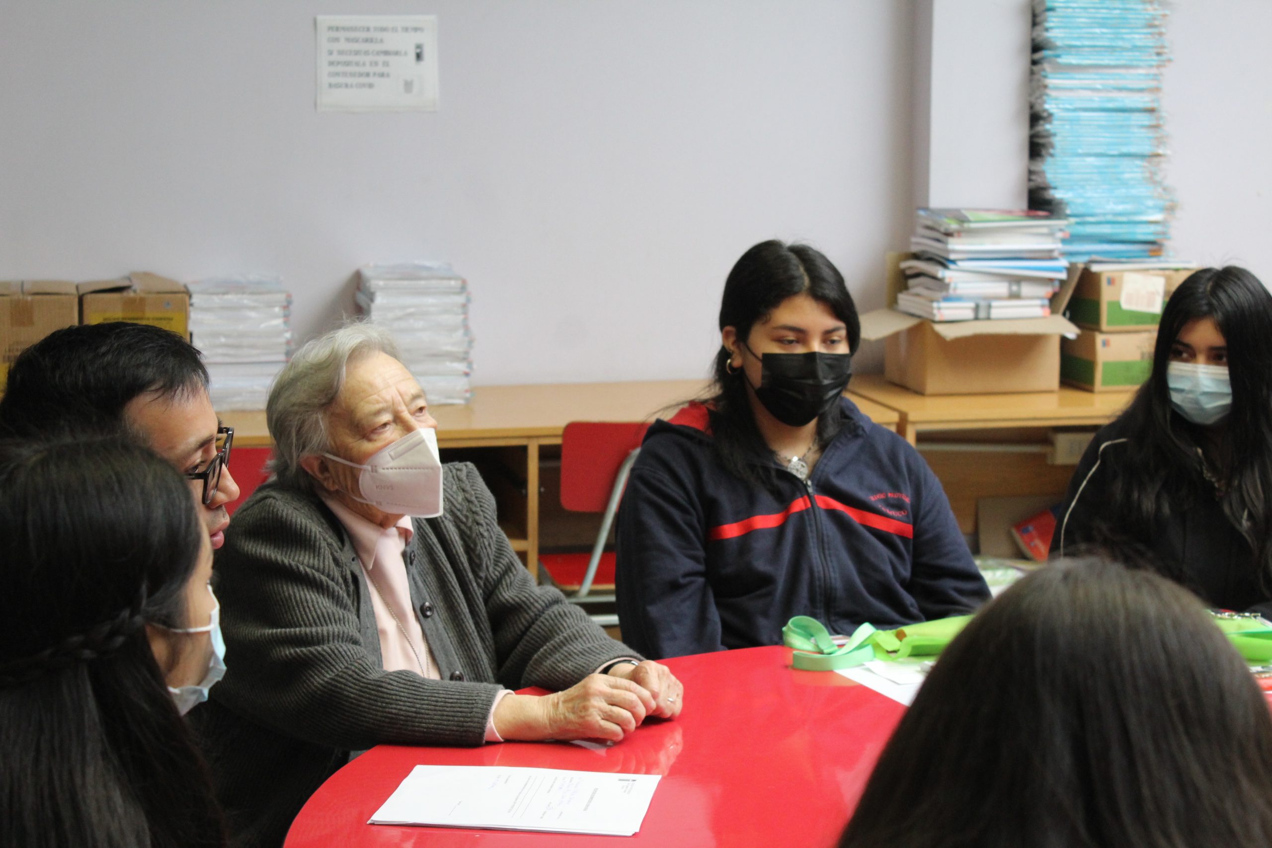 En la actividad de entrega de Beneficio se realiza un conversatorio con las alumnas en base a sus intereses y proyecciones educacionales, donde participa la Madre Liliana Contador, la asistente social Sra. Jessica Betzhold y el profesor encargado de SEP Carlos Solis.