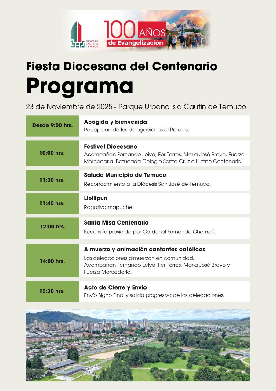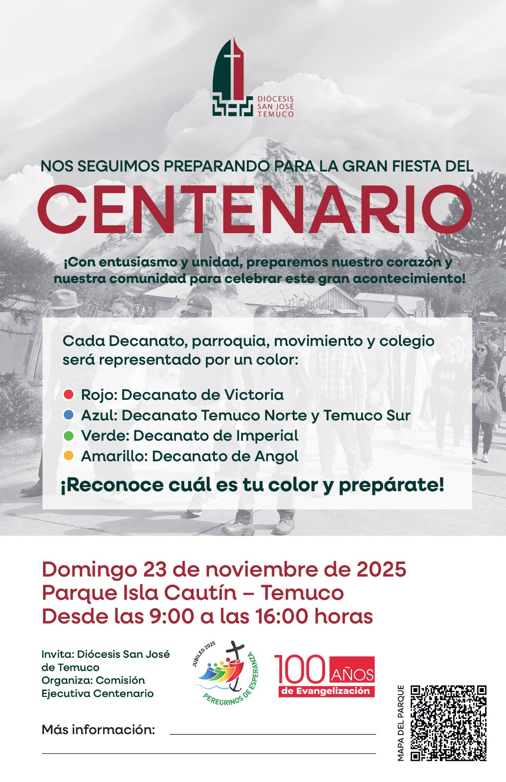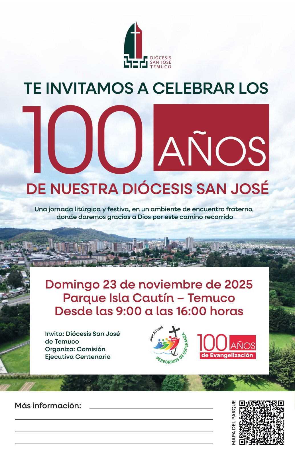 ¡Familia Providencia! Están todos cordialmente invitados a celebrar los 100 años de nuestra diócesis el próximo Domingo 23 de noviembre desde las 9:00 hrs en el Parque Isla Cautín.