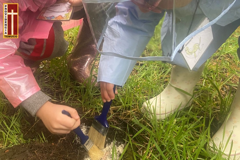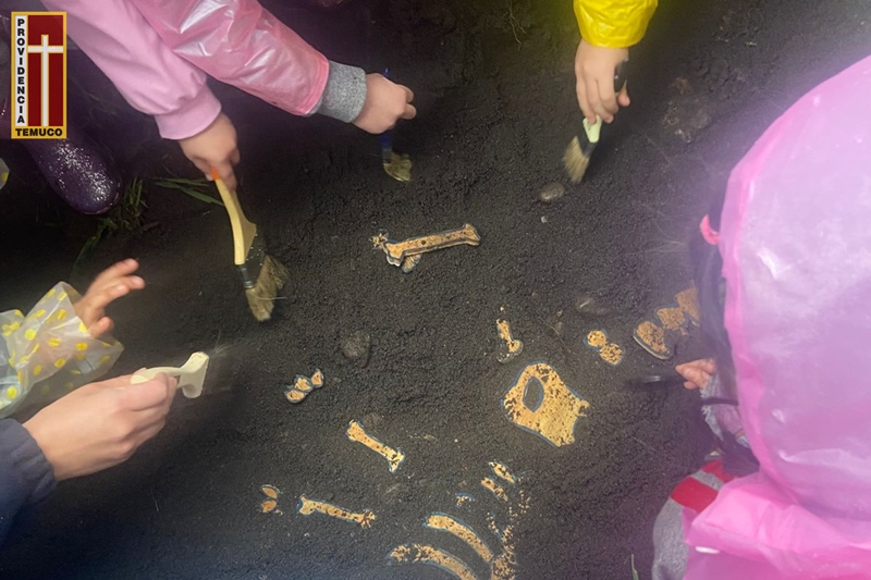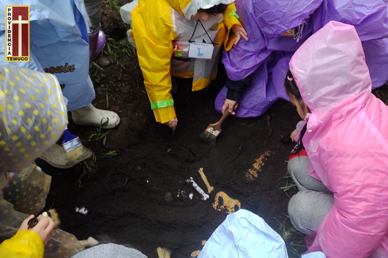 El patio del colegio también se transformó en un verdadero yacimiento, donde con herramientas de excavación encontraron fósiles ocultos, experimentando de manera cercana cómo trabajan los científicos que estudian el pasado prehistórico.