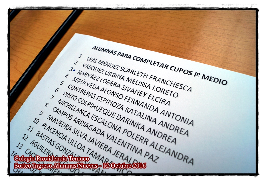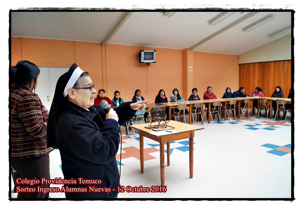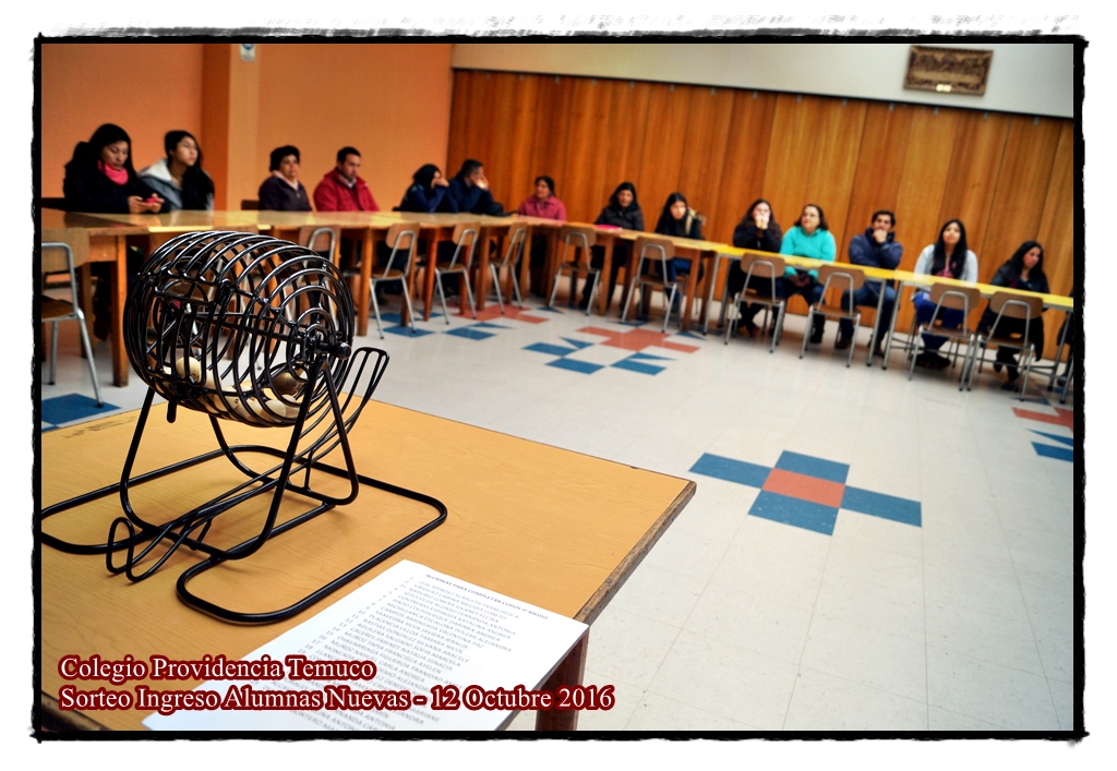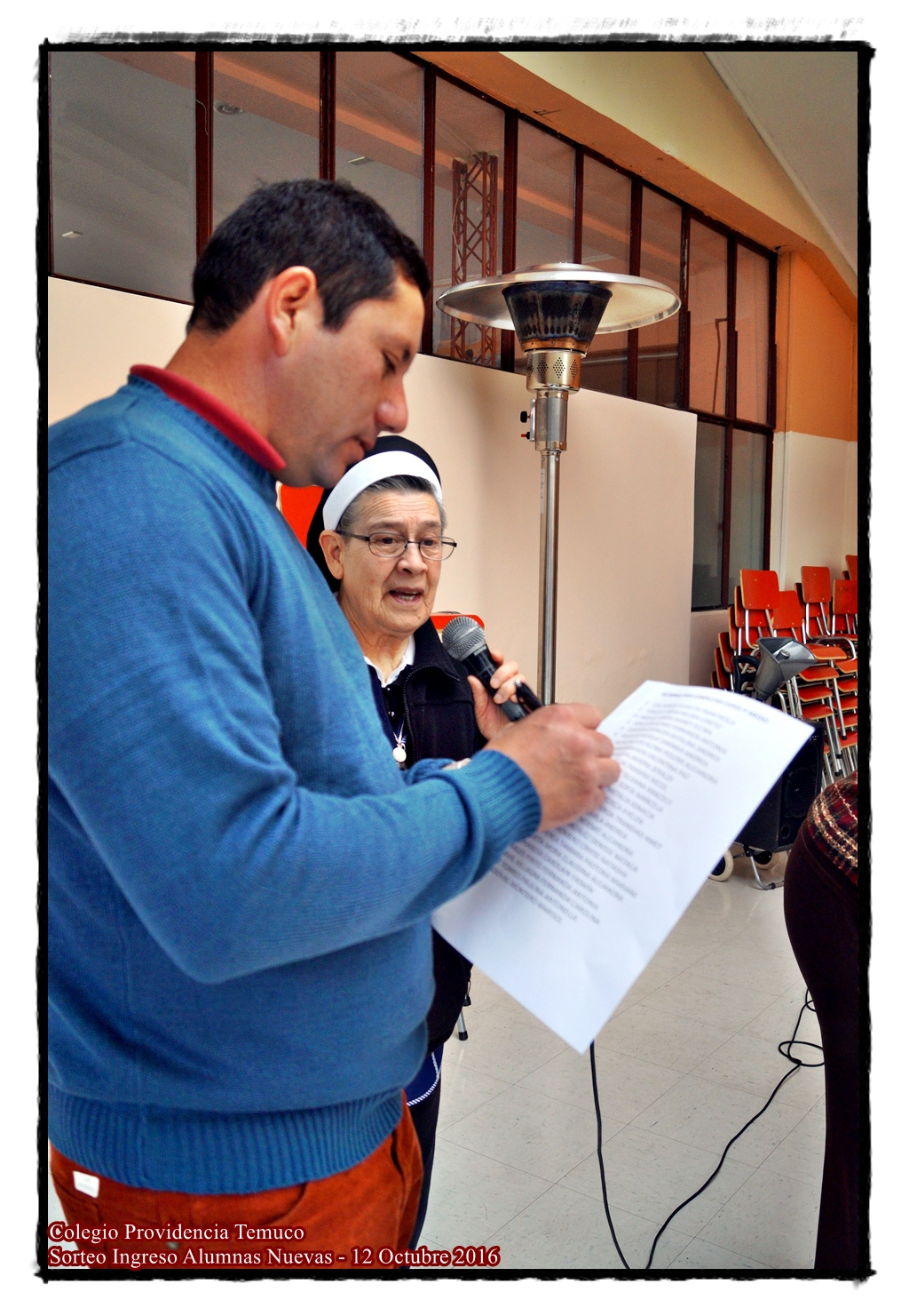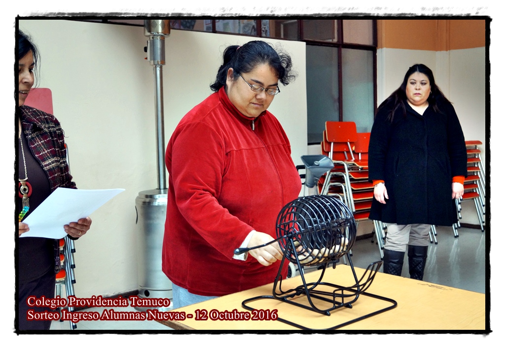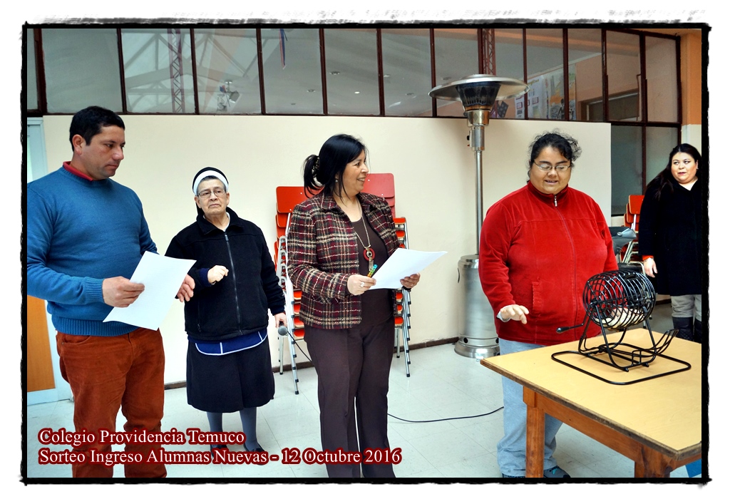 En la ocasión se conto con la presencia de los apoderados de las alumnas postulantes, los cuales dos de ellos fueron los que realizaron para mayor transparencia y seriedad dicho sorteo. Ademas se conto con la presencia de Madre Rebeca Malhue y las secretarias de nuestro colegio.