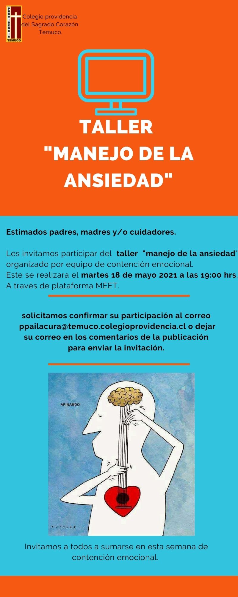 Les invitamos a participar del taller manejo de la ansiedad y de esta manera ser parte de nuestra semana de contención que viene a fomentar el bienestar socioemocional de todos los integrantes de nuestra comunidad educativa.